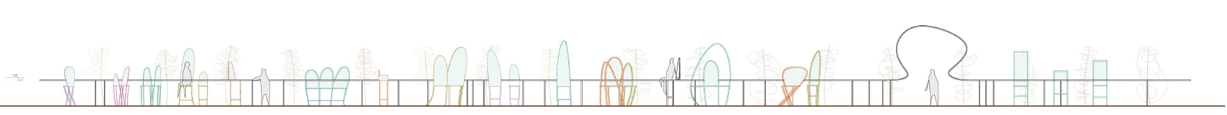 Despite being lined up in the same direction, various of rotations and inclinations are made to the chairs. A vital image of family is thus created by the sequence of resembled objects redolent of sprouting foliage in breeze or multitudes dancing and farming. They are coexisting solitary objects with distinct gestures yet united to share the same table and landscape. Visitors can climb onto the chair to sit and behold the scenery, while watching other individuals sitting around in all kinds of